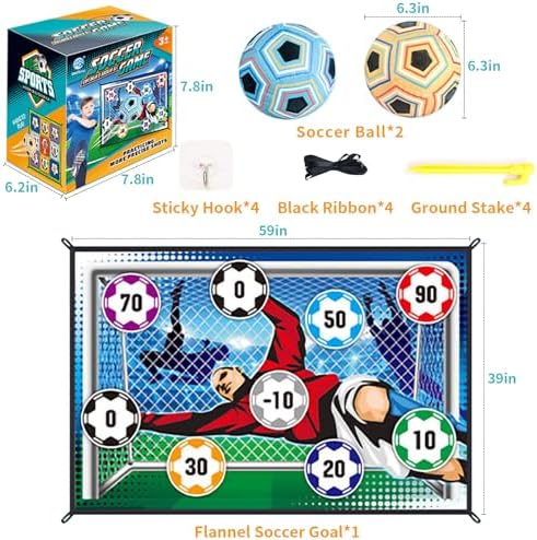 【2-in-1 Soccer Ball Game】 This is a soccer kicking game and sandbag throwing game, allowing you and your kids to enjoy different game modes. Soccer set includes 1 flannel soccer goal, 2 cloth soccer, 4 sticky hooks, 4 black ribbons and 4 ground stakes.