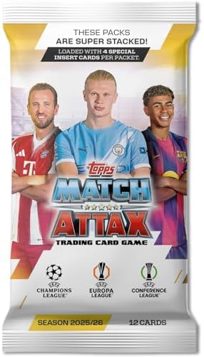 UCC Match Attax returns for the 25/26 season with a thrilling new collection featuring world class players from the UEFA Champions League, UEFA Europa League and the UEFA Europa Conference League. With 524 brand new cards to collect from exciting new categories such as Leaders, Cup Champions, Showboats, Magic Memories, Stealth Strike and Counter Attax, plus returning favourites such as Heritage, Team Badges, Chrome Shield, 100 Club and the unbeatable 100 club, these incredible cards give you everything you need to build a truly incredible collection. Look out for Black Edge cards, Infinity cards, Platinum Pull cards, Hall of Fame Chrome cards, Black Gold LE’s, the new Red Hot Yamal card and the Ice Cole Palmer cards to take you collection to a whole new level. Plus, will you be lucky enough to find a relic card (available inside Booster and Mega Tins only) or the Lethal Combo Auto card or other amazing autograph cards available throughout the collection?